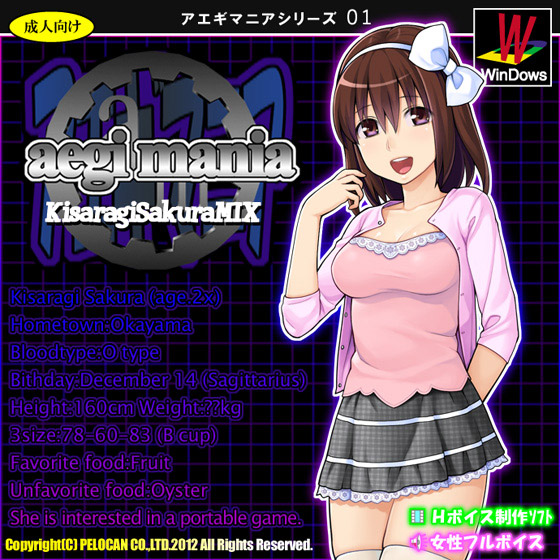 アエギ声など良く使う音声を何パターンか収録してもらいそれを自由に組み合わせてセリフを合成することができる音声素材集です。また、素材集としてだけなく、アドリブ満載のシナリオを用意していますのでゲームとしての実用性も充分だと思います。さらに、ユーザー自身で追加シナリオを作成し、そのセーブデータをネット上で交換することで、無限に新しいシナリオをプレイすることが可能です。・声優さんに喘ぎ声など様々な音声を収録してもらいました・声優さんに100のエッチな質問をぶつけてみました・回答して頂いた情報を元に挿絵を作成しました・アダナ自動生成機能で名前を分析しアダナで呼んでくれます・追加シナリオ作成機能とセーブデータの交換で楽しさ無限大・外部絵表示ができるのでCG集などに音声をつけて遊べます・商用利用も可能ですので詳細はホームページにて!!遊び方については下記URL参照(セリフ合成・シナリオ作成・データ交換)http://pelocan.sakura.ne.jp/voice/aegimania.html#play商用利用については下記URL参照http://pelocan.sakura.ne.jp/voice/aegimania.html#work収録内容については下記URL参照http://pelocan.sakura.ne.jp/voice/aegimania.html#list参加希望のネット声優さんは下記URL参照http://pelocan.sakura.ne.jp/voice/aegimania.html#joinネット声優さんの情報は下記URL参照http://pelocan.sakura.ne.jp/voice/
