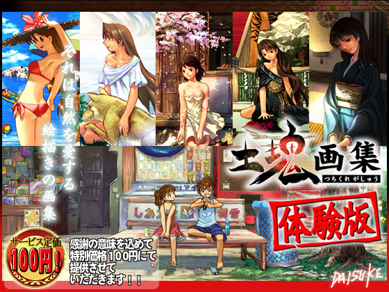 「土塊(つちくれ)ホラーシリーズ」の絵を描きつづける、堀井大介が手掛ける、オリジナル画集がついに発売開始!☆☆☆「土塊画集(体験版)」オススメポイント☆☆☆■画集は、「html形式」で制作されており、快適に作品を楽しむ事が出来ます!■体験版でも、15点もの作品が楽しめます。■作品の全部に、作者の堀井大介のコメントつき!■「死の霊園」や「書いてある」などの土塊ホラー作品の設定画像、秘蔵画像なども収録!■土塊ホラーシリーズで御馴染みの『H/MIX GALLERY』様の曲をBGMとして採用!■株式会社アイディアファクトリー様の許可を頂き 現在好評発売中のPS2用ゲーム「NUGA-CEL!」の背景画像等も収録!■おまけとして、「堀井大介」の絵の描き方も、ご披露いたします♪この商品は、体験版的な扱いですので、すべての絵が見れるわけではございませんがそのほかは、「土塊画集」とまったく同じ状態になっております。(なお、この商品は、 予告なく販売を停止する可能性があります。ご了承ください。)土塊では、他の商品も好評発売中です。ご購入いただいた方、本当にありがとうございます。■「土塊画集」■「こっくりさんの墓」■「土塊ホラーシリーズ 全部パック 第一弾」土塊作品を今後ともよろしくお願いいたします。