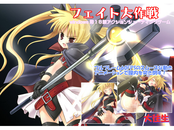 怒涛のせまり来る敵を下まで落とさずに排除するフルフレーム60フレームのアクションシューティングゲーム。難易度があがるごとに「フェイト」の陵辱されるクリアアニメCGのえっち度が上昇していきます。またクリアしたアニメCGはCGモードでいつでも閲覧できます。今回FLASHファイル同梱で膣内中出し射精をお楽しみ頂けます。http://www.daiojyo.com