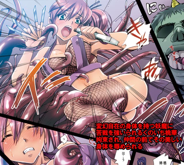 時は戦乱の世。女体の肉林に足を踏み入れた紅葉・桃華・藤3人のくのいちは捕らえられ、見世物じみた御前試合を強要される。巨大な蛸の妖怪相手に三日三晩の悶絶の末辛勝するも、意識を失った年少の藤。その姿に必勝を誓い、次に進み出たのはくのいち桃華。対するは、自在にその姿を変える大型妖怪「鬼流丸」。奮闘するも、その質量すら自在に操る圧倒的な妖術の前に、ただ翻弄されるばかりの桃華。人に、牛に、鬼に…、無数に増える男性器に…!犯されながらも彼女はその胎内で忍術を仕掛けていた。仲間を救う決死の一手を…!妖魔VSくのいちのオリジナル異種姦エロ活劇です。PDFと高解像度Jpegの2種を同梱してあります。今作は、以下作品の続編となります。あらすじを載せてありますので、今作を単独で読まれても理解には問題はないかと思いますが、よろしければ前作も併せて見て頂けると幸いです。前作・女肉忍法帳~第二夜・忍法蛇腹~前々作・女肉忍法帳~第一夜・肉林の娘~ 前々々作・女肉林~くのいち拡張孕ませ創作漫画~
