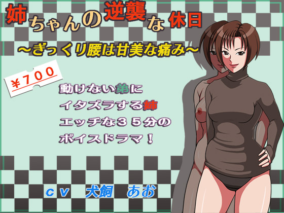 この作品は、ぎっくり腰で動けなくなった弟にエッチないたずらをする姉の音声物語です物語の弟になりきってお楽しみください◇物語の前書き◇今日は休日親は久々の夫婦水入らずの旅行に出かけていて家には私と弟だけ私は部屋で昨日仕事帰りに借りてきた映画のDVDをゆっくりと楽しむ予定だっただが今朝、朝洗面所にいったら、弟が腰をおさえてうずくまっていた聞くとどうやらギックリ腰らしいこれは生意気な弟に復讐するまたとないチャンス!さぁて、どうしてあげようかなぁ♪■ 製品の内容 ■00:00~ はじめに00:26~ 会話07:18~ 手コキ・皮むき12:50~ フェラチオ17:23~ 脱衣20:44~ クンニ24:24~ アナル(姉の)舐め28:04~ 生セックス35:01~ 事後・おしまい全36分24秒の物語です体験版では13分23秒まで聞くことができます☆声の担当(敬称略)☆犬飼 あお◆どうぞよろしくお願いします