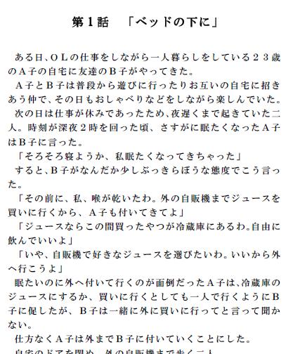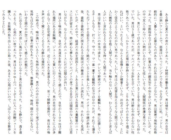 この日記は、私が富士の樹海に友達と散策に行ったときに森の奥で拾ったものです。「僕が死ぬ前に日記を残すことに決めたのは、僕の死への決意が、死への恐怖などはるかに勝っていることを、自殺するまでの記録を残すことで示したいと思ったからだ。」死の直前まで男は日記を書き続けた。ある男が残した自殺するまでの最期の3日間の日記。そこには男の死への揺るぎない決意と、死を決意した上で心に生まれる様々な想いが綴られていた。男は、死への確固たる決意の中で、どのような想いを持って最後の時を過ごしたのだろうか?短編の創作小説です。5600字程度です。 |