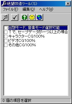 KISSより・・・ のセーブファイルを書き換えて、CGモードをONにします。面倒な操作は一切無し。ゲームがインストールされているフォルダに解凍し、実行するだけでセーブファイルの書き換えが終了します。 |
